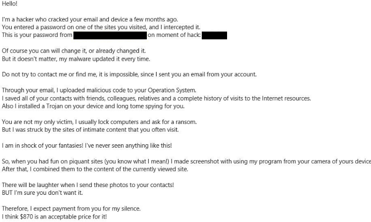 Se ha detectado una nueva campaña de correos electrónicos fraudulentos, que tratan de extorsionar a la víctima con supuestas imágenes de contenido sexual. En el correo se asegura que el ordenador de la víctima ha sido infectado y se ha obtenido su contraseña, sus contactos (amigos, familia, compañeros de trabajo, etc.) y su historial de búsquedas en Internet. Pero, además, el estafador afirma tener imágenes de la víctima de contenido sexual y amenaza con difundirlas entre sus contactos si no realiza un pago en Bitcoins. Para darle más credibilidad al correo, se facilita una contraseña asociada a la cuenta. El mensaje podría ser similar al que te mostramos a continuación: