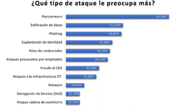 Si hablamos de tipología, según datos del Estudio de la Ciberseguridad en España 2023, elaborado por Secure&IT, el ransomware sigue siendo la principal preocupación del 93,9% de los profesionales encuestados, seguido de la exfiltración de datos (52,1%) y el phishing (50,8%).